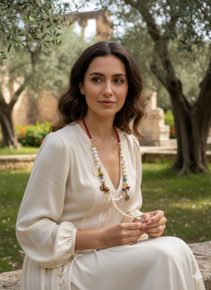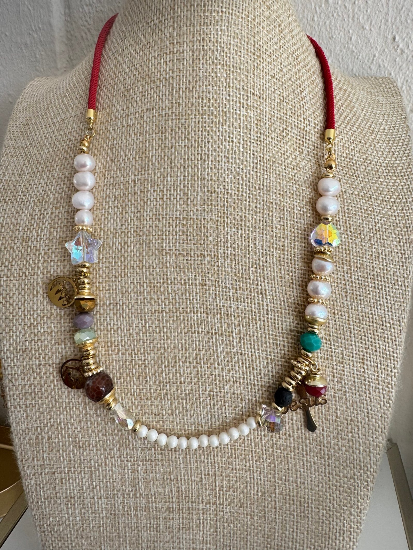 El collar o pulsera “La Vida de Jesús de Nazaret” es una pieza única que combina elementos simbólicos y coloridos. Está adornado con perlas blancas y cuentas de diversos colores, que representan la diversidad y la riqueza de la vida.