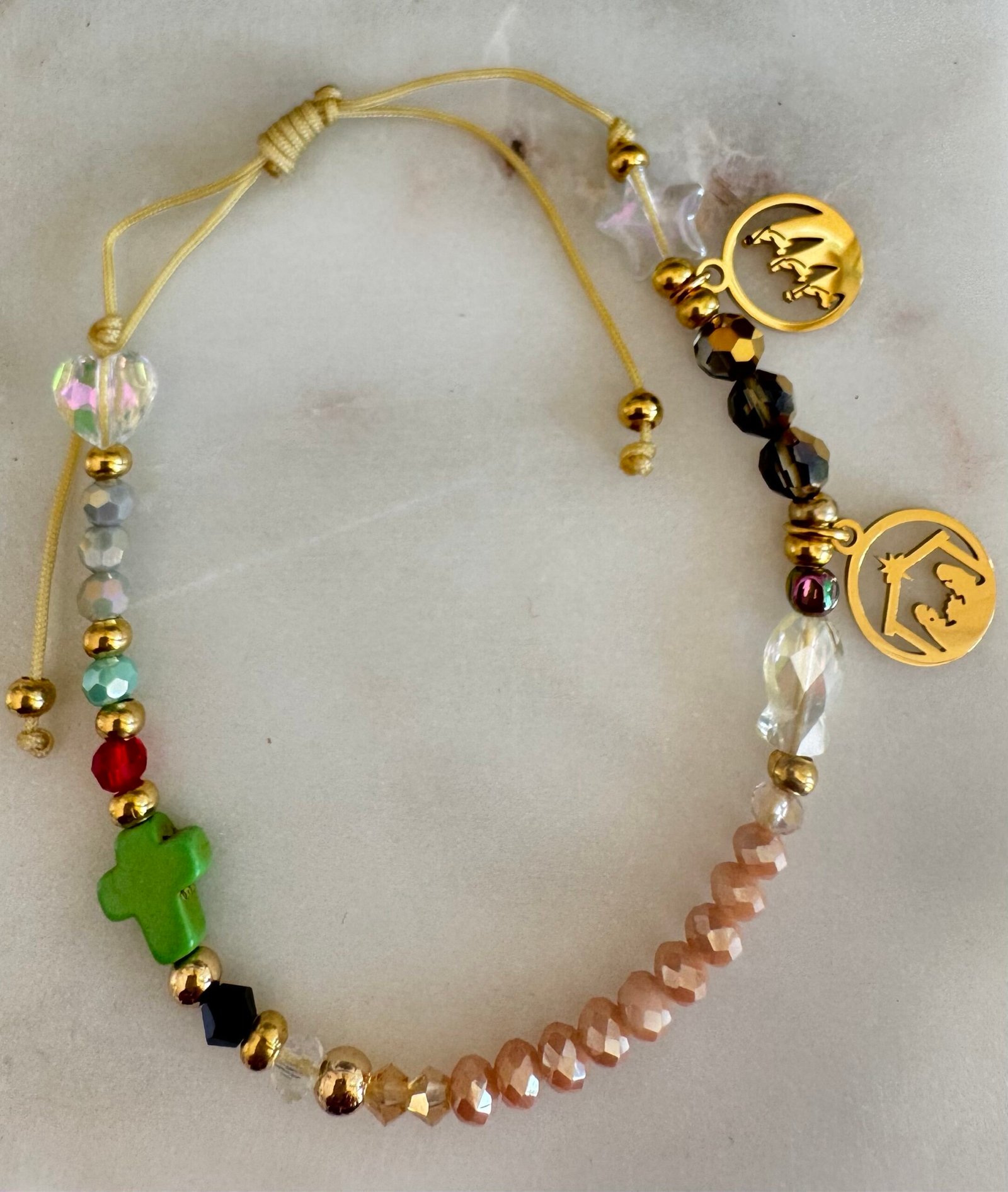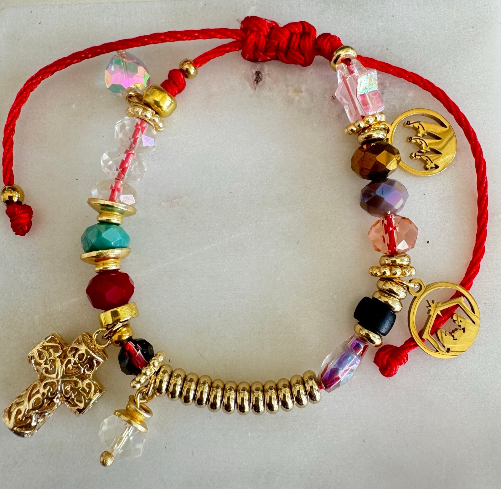 Incluye charms que evocan la historia de Jesús, como una cruz, un símbolo de fe y sacrificio, y otros elementos que reflejan su enseñanza y su amor. El diseño resalta la conexión espiritual y la devoción, convirtiéndolo en un accesorio significativo para quienes desean llevar consigo la esencia de su historia.